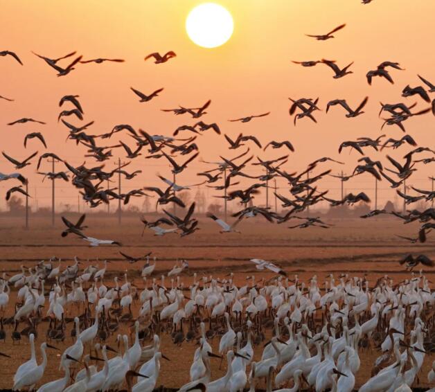 自十月以来,鄱阳湖国家级自然保护区内的多个保护站相继监测到越冬候鸟的踪迹,原本静谧的鄱阳湖畔渐渐热闹起来。浅水区里,白琵鹭挺着修长身姿,用标志性的勺状长喙在水中探寻食物,动作优雅又专注;草洲之上,成群的白额雁或低头啄食、或梳理羽毛,自在栖息;湖面之上,鸿雁与豆雁结伴游弋,时而低空盘旋、时而水面嬉戏,此起彼伏的鸣叫声交织成一曲自然交响乐,构成一幅和谐动人的生态画卷,让前来观测的游客与摄影爱好者大饱眼福。