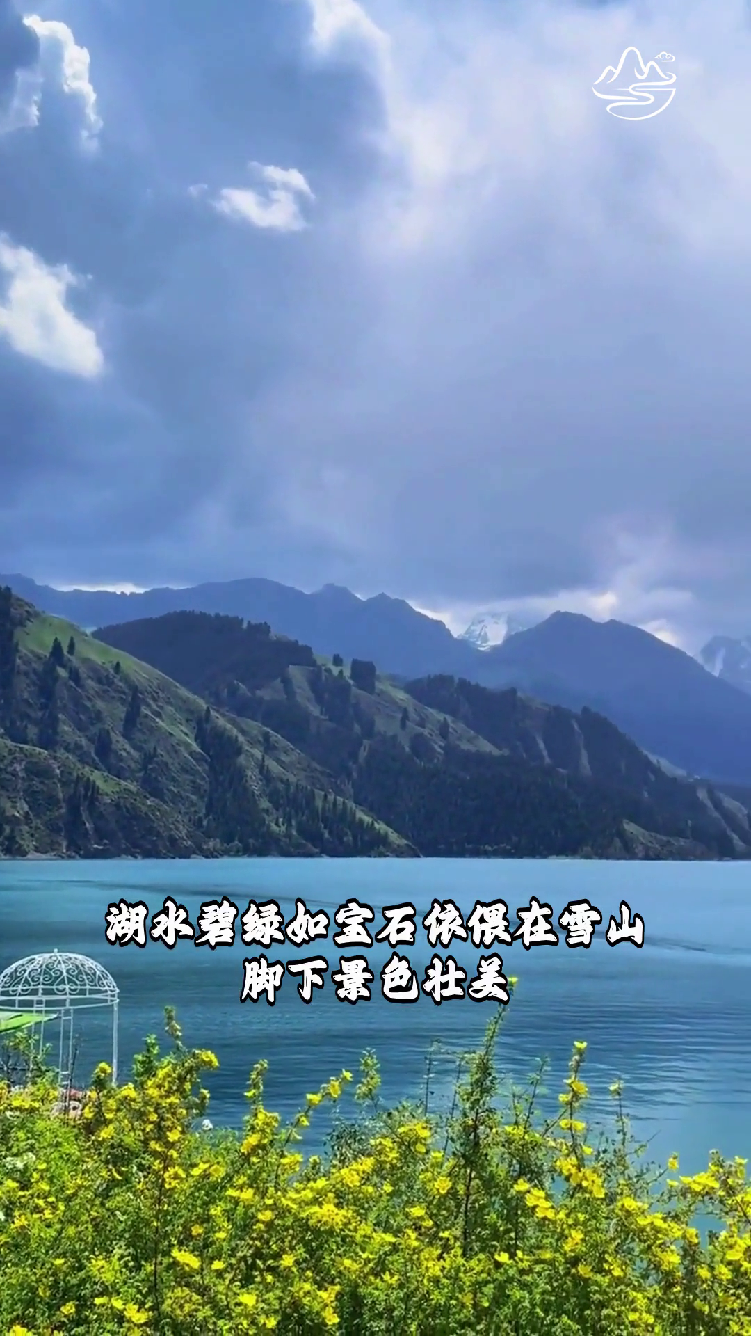 新疆天山天池风景名胜区 湖水碧绿如宝石依偎在雪山脚下景色壮美